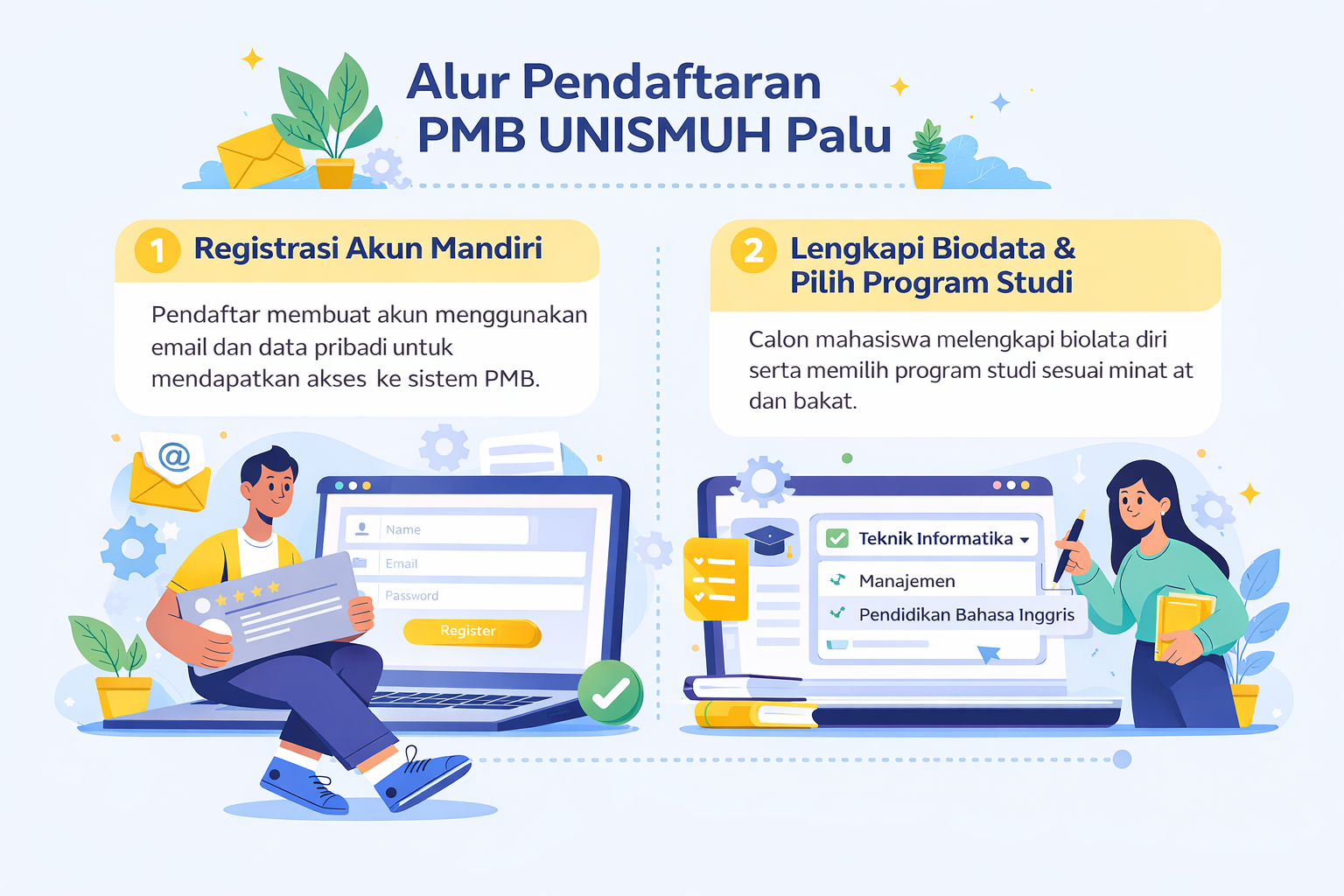 Calon mahasiswa dapat melakukan pendaftaran PMB UNISMUH Palu secara online kapan saja dan di mana saja melalui sistem yang telah disediakan.